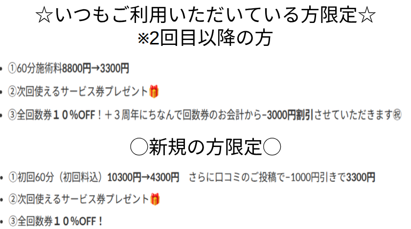 感謝の気持ちを込めてささやかながら・施術料割引・サービス券プレゼント・回数券10%OFFをさせていただきます🙏