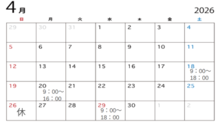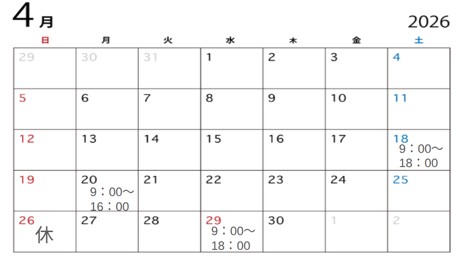 ※日曜日 9:00〜13:00、月曜日 9:00〜18:00、その他火曜〜土曜は9:00〜20:00の完全予約制となっております。