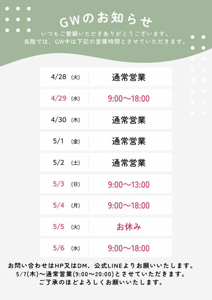 リベロ整体院です。いつも当院をご利用いただきありがとうございます♪ ◯GW期間の営業時間時間について◯ 5月5日(火)はお休みとさせていただきますが、基本的に短縮時間の営業とさせていただきます🙇 当院は完全予約制となって […]